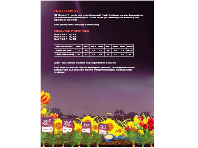 完璧なバランスのリンとカリウム、適正量のマグネシウムと微量栄養素の働きにより、これまで以上にはやく・色艶の良い開花・収穫量の増加を提供します。