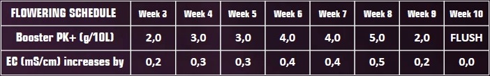 ※上の使用量目安表は短日植物の一般的なスケジュール(発芽から収穫までを約10週間で表した)表に基づいており、9週目に肥料の与える量を減らし、10週目に肥料抜きをして、その後収穫する事を目安としています。植物の品種により開花期間が短かったり長かったりする場合は、与える数値を調整する必要があります。それぞれの数値は肥料に合わせた使用量目安表をご参照ください。