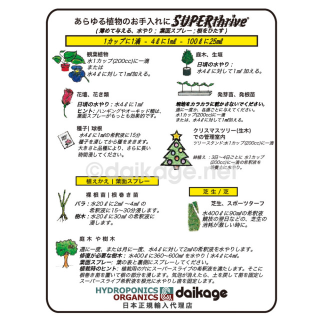 スーパースライブは、植えかえ時には根をダメージから守り、環境ストレスを受けたプラントには回復を早めて、豊富な花つきと収穫へ導きます。使用量は、ほんのわずかですが即効性が高く、コストパフォーマンが非常に高い植物活性剤です。安全で環境に完全に無害なスーパースライブは、あらゆる植物に水やり、葉面スプレー、培養液に添加など、あらゆる方法で与えることができます。